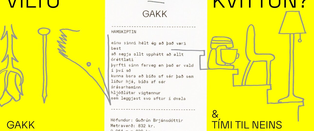 Velkomin að kíkja við á gjörning og útgáfu verkanna Gakk eftir Guðrúnu Brjánsdóttur og Tími til neins eftir Elínu Eddu sem haldin verða í Skáldu laugardaginn 18. október milli 13–16.