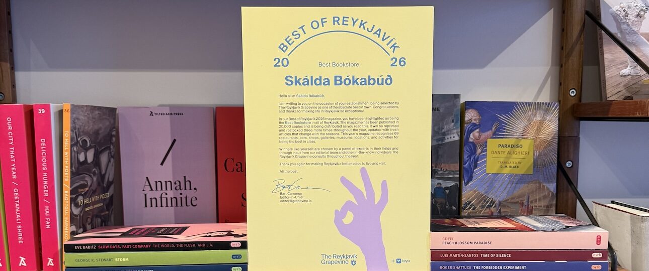 Each year, The Reykjavík Grapevine publishes a special issue in which experts select the very best that the city has to offer. Skálda first received this recognition last year, after only four months in operation, and it was recently announced that Skálda was named Best Bookstore in Reykjavík for the second year in a row.