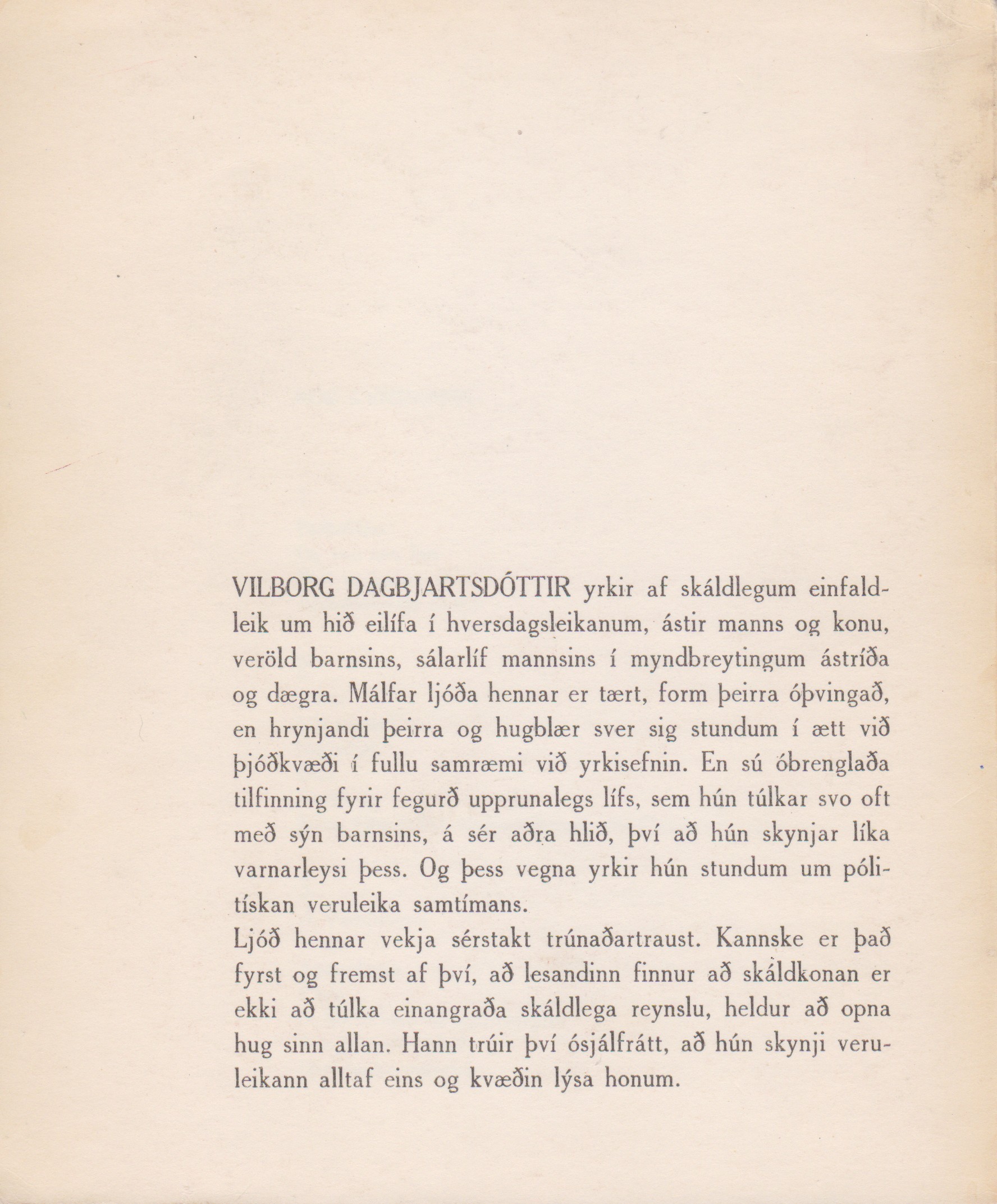 VILBORG DAGBJARTSDÓTTIR yrkir af skáldlegum einfaldleik um hið eilífa í hversdagsleikanum, ástir manns og konu, veröld barnsins, sálarlíf mannsins í myndbreytingum ástríða og dægra. Málfar ljóða hennar er tært, form þeirra óþvingað, en hrynjandi þeirra og hugblær sver sig stundum í ætt við þjóðkvæði í fullu samræmi við yrkisefnin. En sú óbrenglaða tilfinning fyrir fegurð upprunalegs lífs, sem hún túlkar svo oft með sýn barnsins, á sér aðra hlið, því að hún skynjar líka varnarleysi þess. Og þess vegna yrkir hún stundum um pólitískan veruleika samtímans.