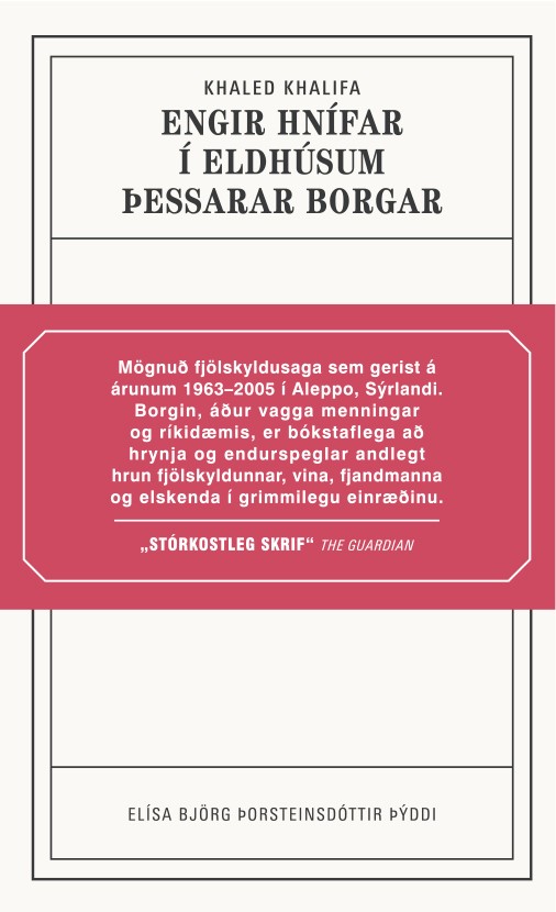 Khaled Khalifa er þekktasti samtímahöfundur Sýrlands. Hann er búsettur í Damaskus. Engir hnífar í eldhúsum þessarar borgar hlaut Naguib Mahfouz-bókmenntaverðlaunin, auk þess að vera tilnefnd til arabísku Man-verðlaunanna. Þetta er önnur bók Khalifa á íslensku. Sú fyrri, Dauðinn er barningur kom út hjá Angústúru árið 2019.