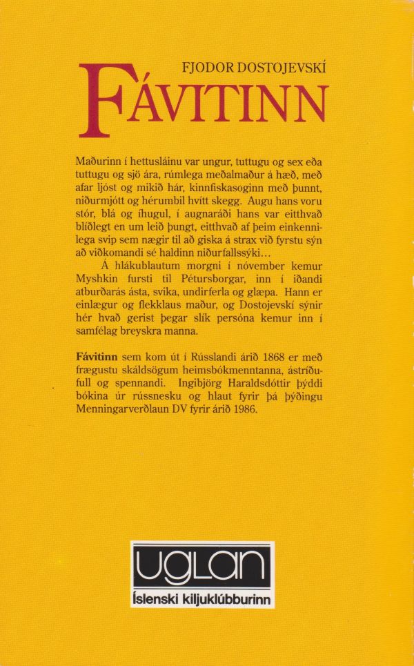Fávitinn sem kom út í Rússlandi árið 1868 er með frægustu skáldsögum heimsbókmenntanna, ástríðufull og spennandi. Ingibjörg Haraldsdóttir þýddi bókina úr rússnesku og hlaut fyrir þá þýðingu Menningarverðlaun DV fyrir árið 1986.