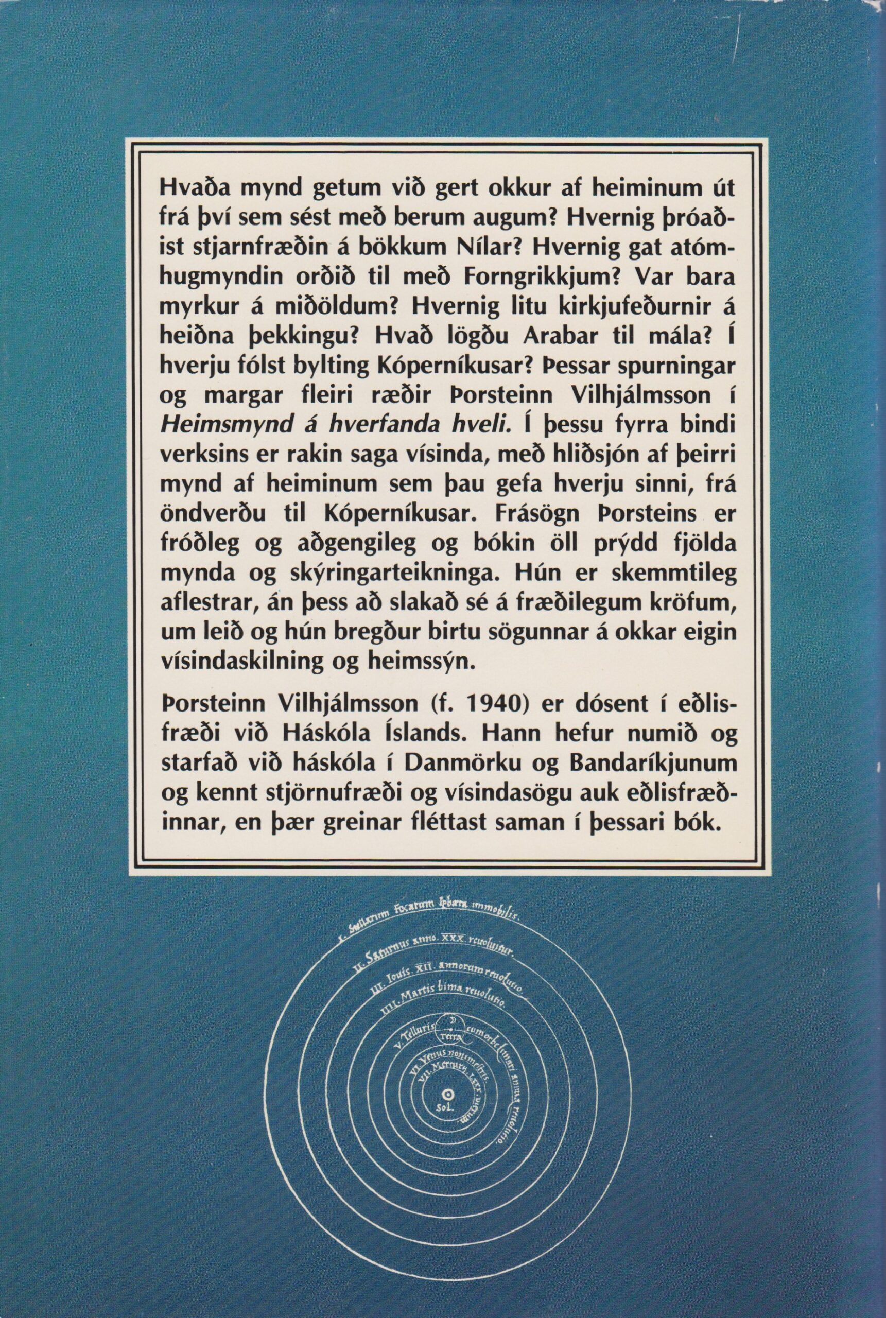 Hvaða mynd getum við gert okkur af heiminum út frá því sem sést með berum augum? Hvernig þróaðist stjarnfræðin á bökkum Nílar? Hvernig gat atómhugmyndin orðið til með Forngrikkjum? Var bara myrkur á miðöldum? Hvernig litu kirkjufeðurnir á heiðna þekkingu? Hvað lögðu Arabar til mála? Í hverju fólst bylting Kóperníkusar? Þessar spurningar og margar fleiri ræðir Þorsteinn Vilhjálmsson í Heimsmynd á hverfanda hveli. Í þessu fyrra bindi verksins er rakin saga vísinda, með hliðsjón af þeirri mynd af heiminum sem þau gefa hverju sinni, frá öndverðu til Kóperníkusar. Frásögn Þorsteins er fróðleg og aðgengileg og bókin öll prýdd fjölda mynda og skýringarteikninga. Hún er skemmtileg aflestrar, án þess að slakað sé á fræðilegum kröfum, um leið og hún bregður birtu sögunnar á okkar eigin vísindaskilning og heimssýn.