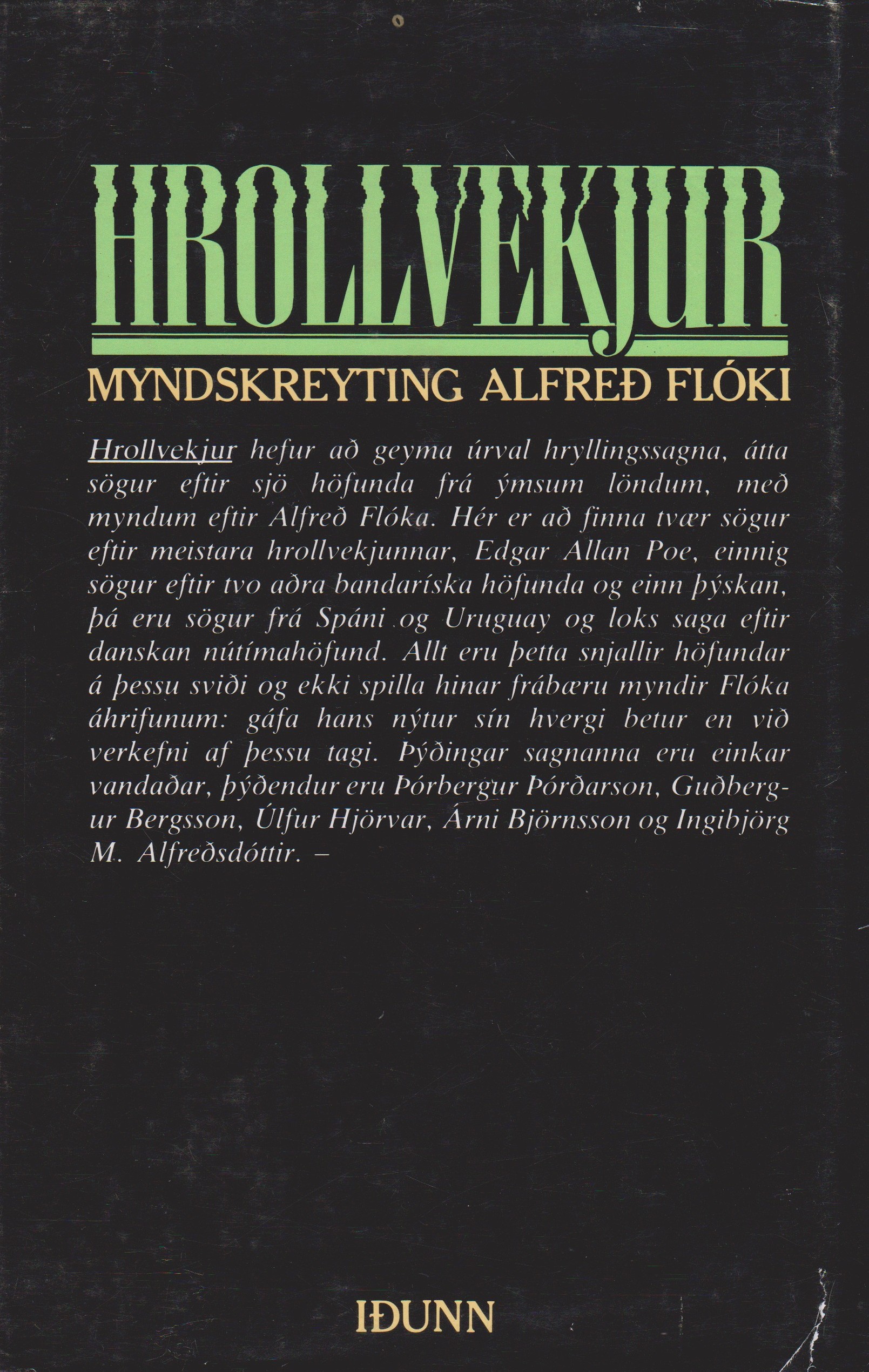 Hrollvekjur hefur að geyma úrval hryllingssagna, átta sögur eftir sjö höfunda frá ýmsum löndum, með myndum eftir Alfreð Flóka. Hér er að finna tvær sögur eftir meistara hrollvekjunnar, Edgar Allan Poe, einnig sögur eftir tvo aðra bandaríska höfunda og einn þýskan, þá eru sögur frá Spáni og Uruguay og loks saga eftir danskan nútímahöfund. Allt eru þetta snjallir höfundar á þessu sviði og ekki spilla hinar frábæru myndir Flóka áhrifunum: gáfa hans nýtur sín hvergi betur en við verkefni af þessu tagi. Þýðingar sagnanna eru einkar vandaðar, þýðendur eru Þórbergur Þórðarson, Guðbergur Bergsson, Úlfur Hjörvar, Árni Björnsson og Ingibjörg M. Alfreðsdóttir.