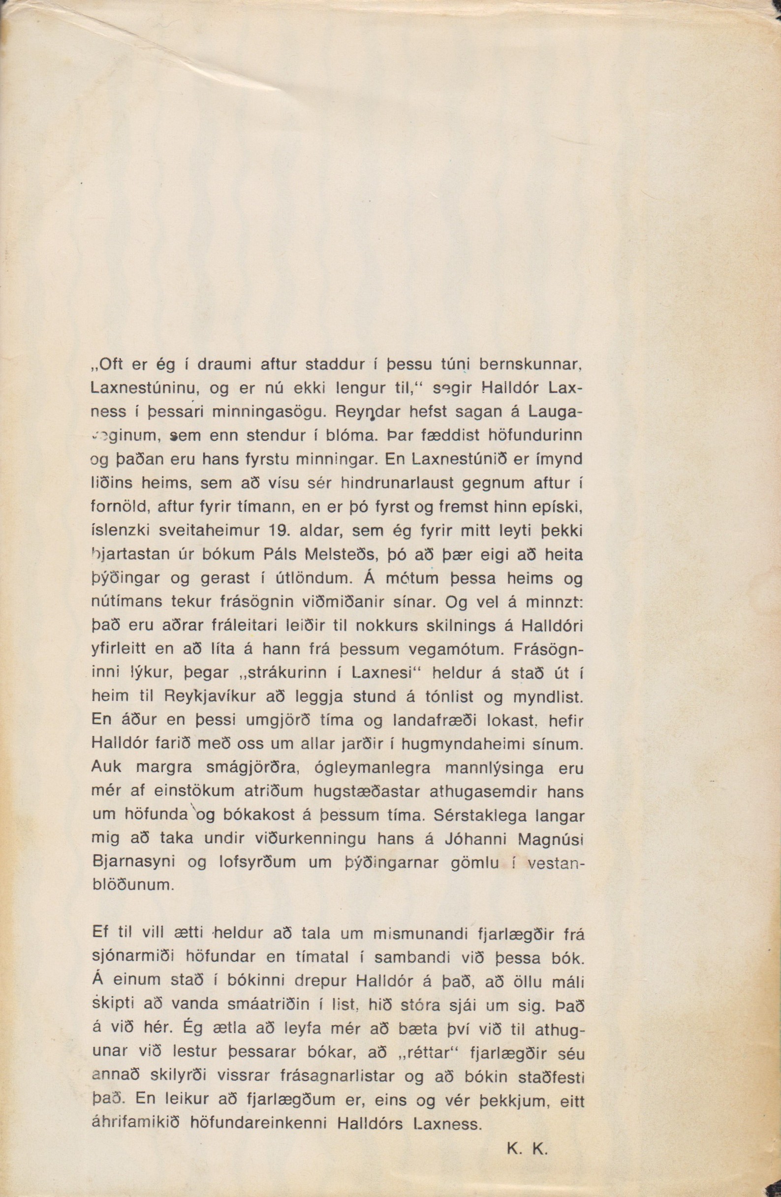 „Oft er ég í draumi aftur staddur í þessu túni bernskunnar, Laxnestúninu, og er nú ekki lengur til,“ segir Halldór Laxness í þessari minningasögu. Reyndar hefst sagan á Laugaveginum, sem enn stendur í blóma. Þar fæddist höfundurinn og þaðan eru hans fyrstu minningar. En Laxnestúnið er ímynd liðins heims, sem að vísu sér hindrunarlaust gegnum aftur í fornöld, aftur fyrir tímann, en er þó fyrst og fremst hinn epíski, íslenzki sveitaheimur 19. aldar, sem ég fyrir mitt leyti þekki bjartastan úr bókum Páls Melsteðs, þó að þær eigi að heita þýðingar og gerast í útlöndum. Á mótum þessa heims og nútímans tekur frásögnin viðmiðanir sínar. Og vel á minnzt: það eru aðrar fráleitari leiðir til nokkurs skilnings á Halldóri yfirleitt en að líta á hann frá þessum vegamótum. Frásögninni lýkur, þegar „strákurinn í Laxnesi“ heldur á stað út í heim til Reykjavíkur að leggja stund á tónlist og myndlist. En áður en þessi umgjörð tíma og landafræði lokast, hefir Halldór farið með oss um allar jarðir í hugmyndaheimi sínum. Auk margra smágjörðra, ógleymanlegra mannlýsinga eru mér af einstökum atriðum hugstæðastar athugasemdir hans um höfunda og bókakost á þessum tíma. Sérstaklega langar mig að taka undir viðurkenningu hans á Jóhanni Magnúsi Bjarnasyni og lofsyrðum um þýðingarnar gömlu í vestanblöðunum.