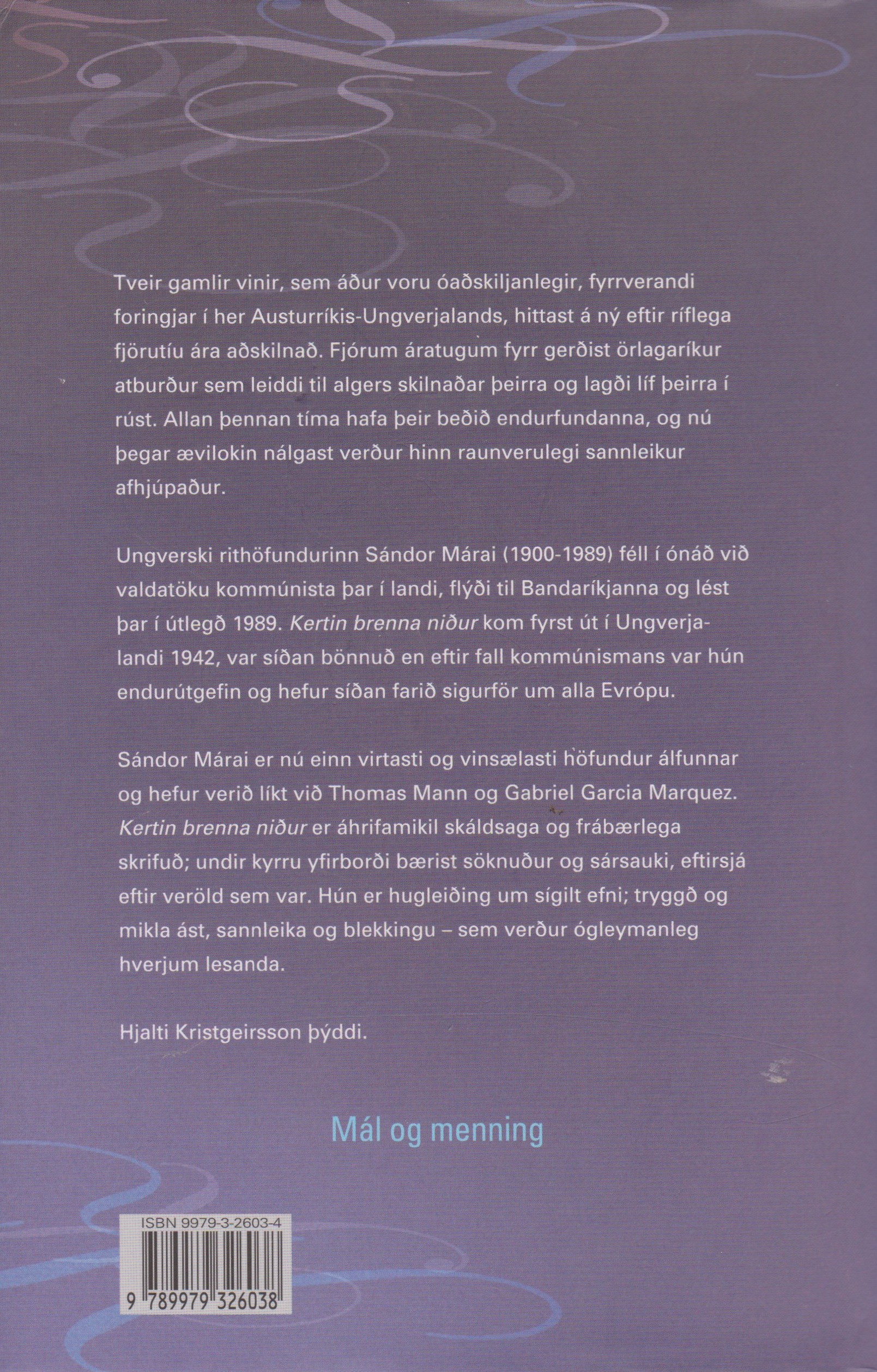 Ungverski rithöfundurinn Sándor Márai (1900-1989) féll í ónáð við valdatöku kommúnista þar í landi, flýði til Bandaríkjanna og lést þar í útlegð 1989. Kertin brenna niður kom fyrst út í Ungverjalandi 1942, var síðan bönnuð en eftir fall kommúnismans var hún endurútgefin og hefur síðan farið sigurför um alla Evrópu. Sándor Márai er nú einn virtasti og vinsælasti höfundur álfunnar og hefur verið líkt við Thomas Mann og Gabriel García Márquez.