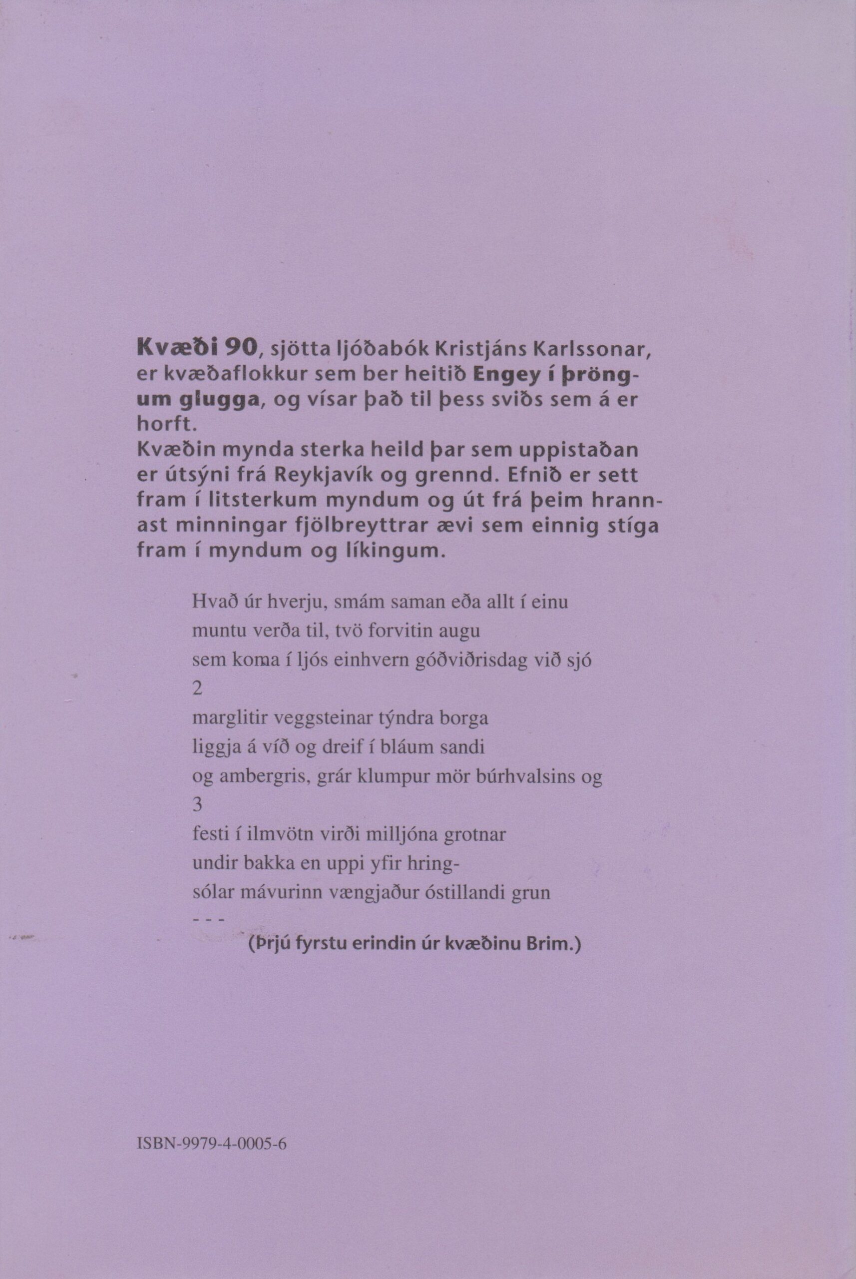 Kvæði 90, sjötta ljóðabók Kristjáns Karlssonar, er kvæðaflokkur sem ber heitið Engey í þröngum glugga, og vísar það til þess sviðs sem á er horft.