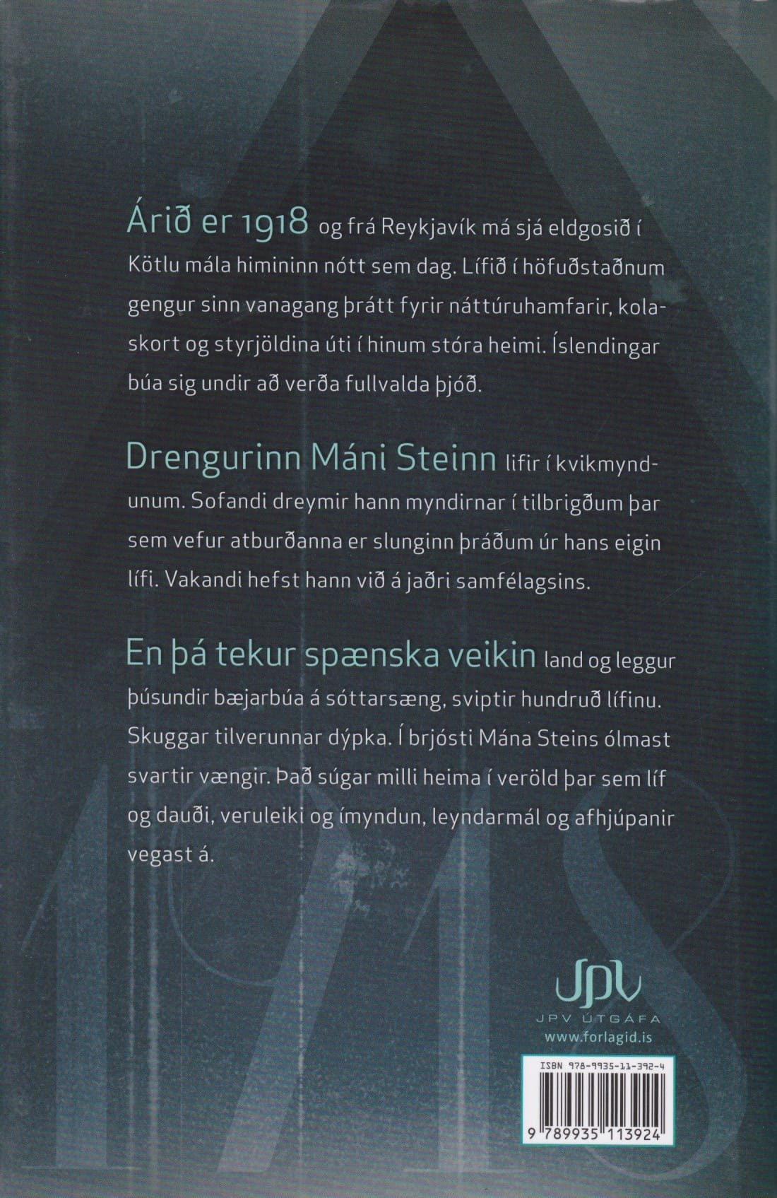 En þá tekur spænska veikin land og leggur þúsundir bæjarbúa á sóttarsæng, sviptir hundruð lífinu. Skuggar tilverunnar dýpka. Í brjósti Mána Steins ólmast svartir vængir. Það súgar milli heima í veröld þar sem líf og dauði, veruleiki og ímyndun, leyndarmál og afhjúpanir vegast á.