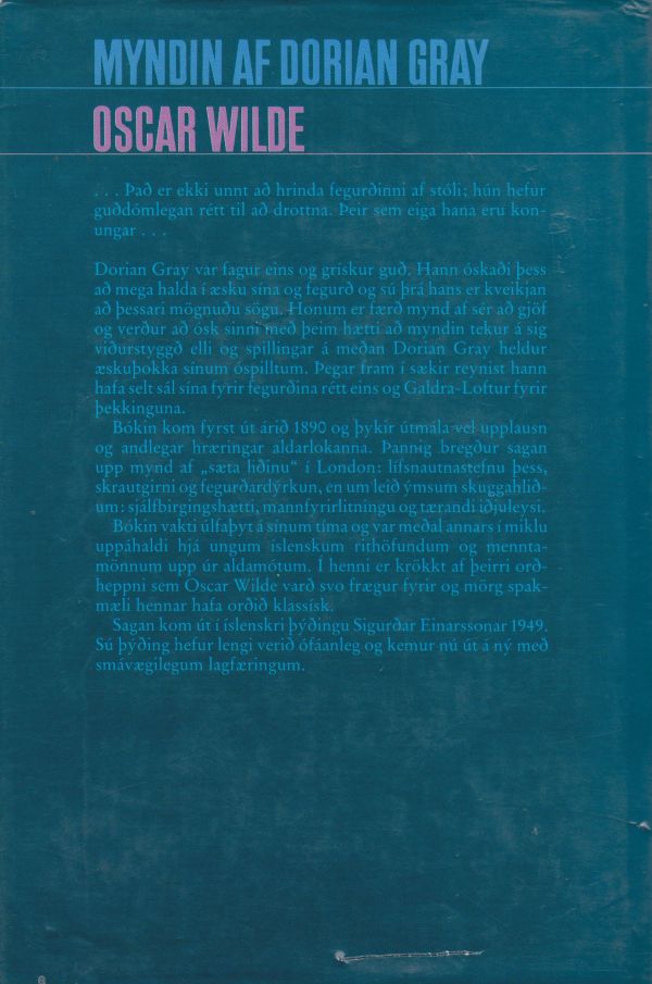 Dorian Gray var fagur eins og grískur guð. Hann óskaði þess að mega halda í æsku sína og fegurð og sú þrá hans er kveikjan að þessari mögnuðu sögu. Honum er færð mynd af sér að gjöf og verður að ósk sinni með þeim hætti að myndin tekur á sig viðurstyggð elli og spillingar á meðan Dorian Gray heldur æskuþokka sínum óspilltum. Þegar fram í sækir reynist hann hafa selt sál sína fyrir fegurðina rétt eins og Galdra-Loftur fyrir þekkinguna.