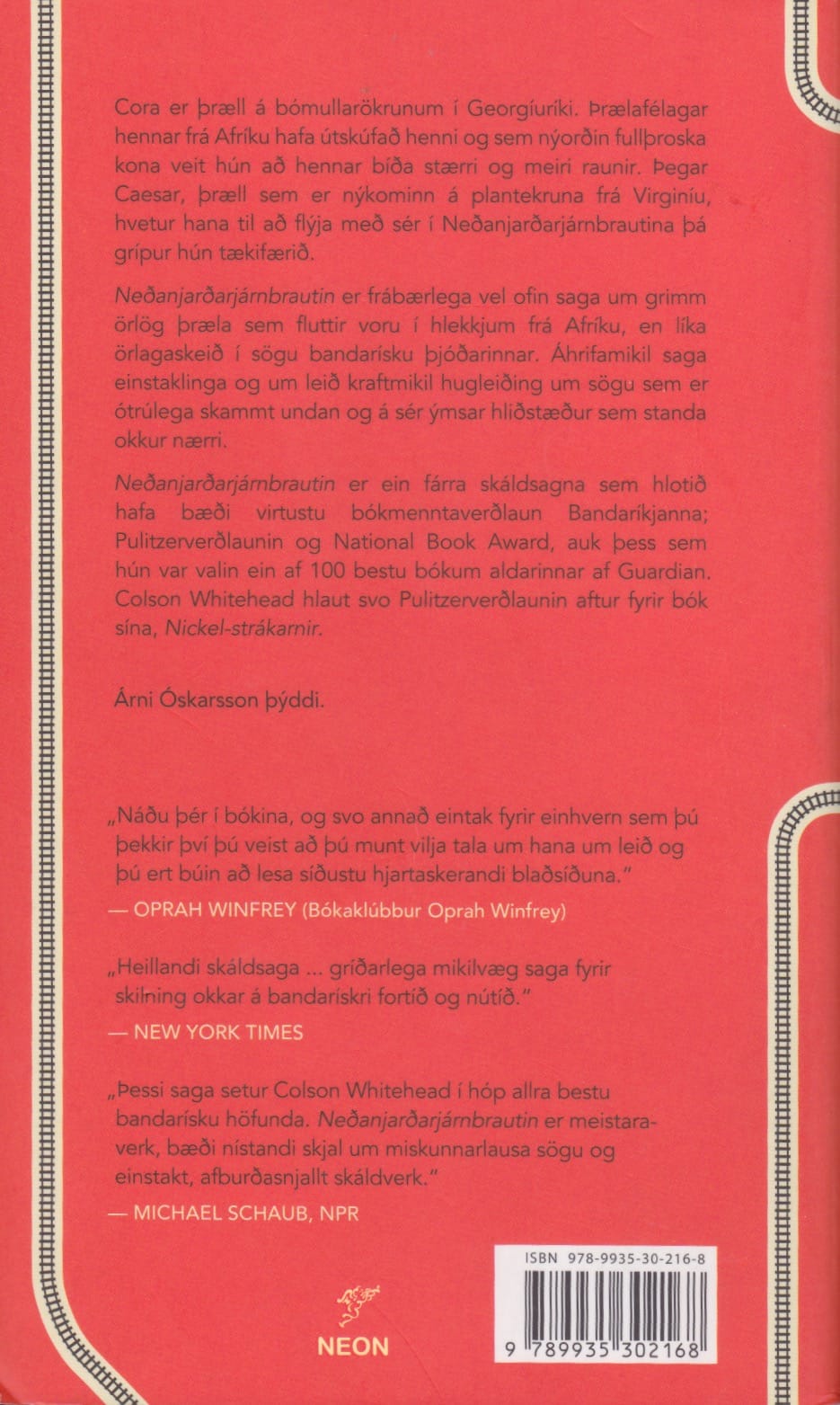 Neðanjarðarjárnbrautin er frábærlega vel ofin saga um grimm örlög þræla sem fluttir voru í hlekkjum frá Afríku, en líka örlagaskeið í sögu bandarísku þjóðarinnar. Áhrifamikil saga einstaklinga og um leið kraftmikil hugleiðing um sögu sem er ótrúlega skammt undan og á sér ýmsar hliðstæður sem standa okkur nærri.