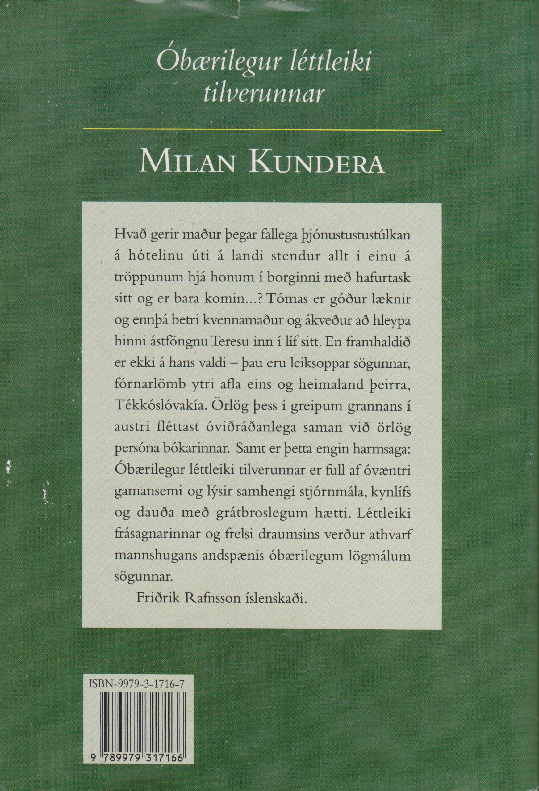 Hvað gerir maður þegar fallega þjónustustustúlkan á hótelinu úti á landi stendur allt í einu á tröppunum hjá honum í borginni með hafurtask sitt og er bara komin…? Tómas er góður læknir og ennþá betri kvennamaður og ákveður að hleypa hinni ástföngnu Teresu inn í líf sitt. En framhaldið er ekki á hans valdi – þau eru leiksoppar sögunnar, fórnarlömb ytri afla eins og heimaland þeirra, Tékkóslóvakía. Örlög þess í greipum grannans í austri fléttast óviðráðanlega saman við örlög persóna bókarinnar. Samt er þetta engin harmsaga: Óbærilegur léttleiki tilverunnar er full af óvæntri gamansemi og lýsir samhengi stjórnmála, kynlífs og dauða með grátbroslegum hætti. Léttleiki frásagnarinnar og frelsi draumsins verður athvarf mannshugans andspænis óbærilegum lögmálum sögunnar.