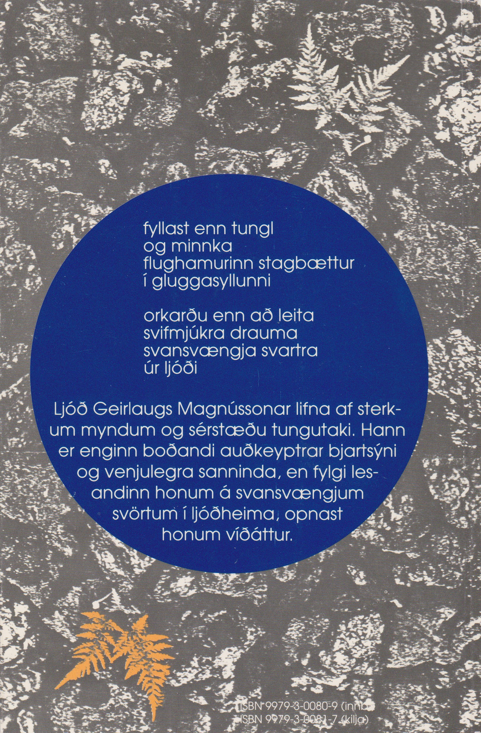 Ljóð Geirlaugs Magnússonar lifna af sterkum myndum og sérstæðu tungutaki. Hann er enginn boðandi auðkeyptrar bjartsýni og venjulegra sanninda, en fylgi lesandinn honum á svansvængjum svörtum í ljóðheima, opnast honum víðáttur.