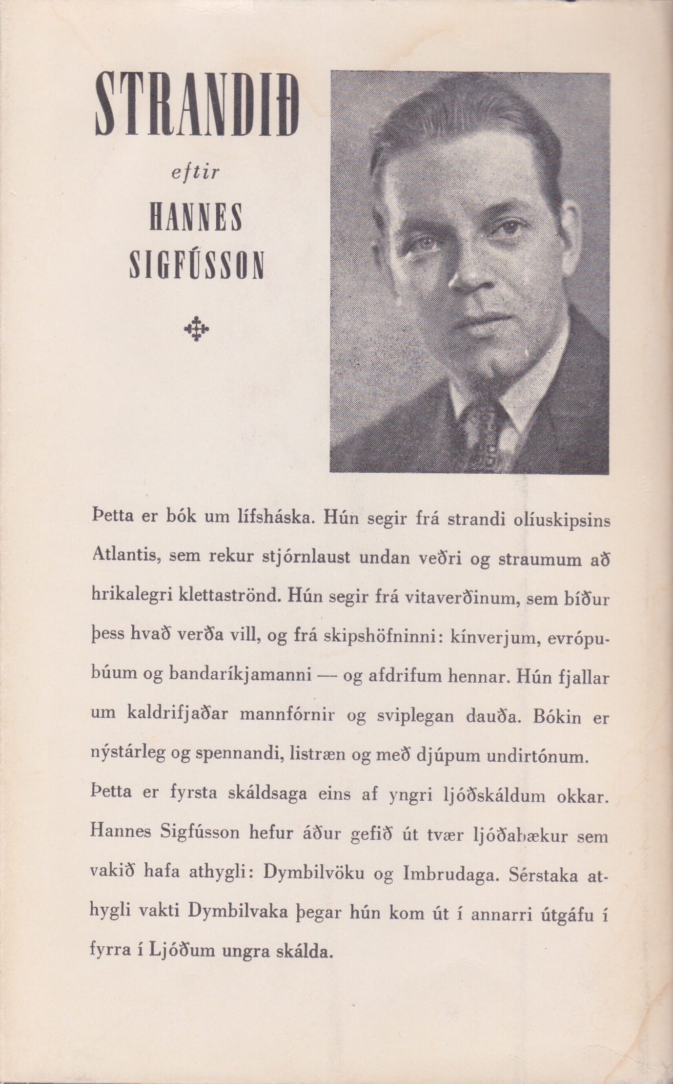 Þetta er bók um lífsháska. Hún segir frá strandi olíuskipsins Atlantis, sem rekur stjórnlaust undan veðri og straumum að hrikalegri klettaströnd. Hún segir frá vitaverðinum, sem bíður þess hvað verða vill, og frá skipshöfninni: kínverjum, evrópu- búum og bandaríkjamanni og afdrifum hennar. Hún fjallar um kaldrifjaðar mannfórnir og sviplegan dauða. Bókin er nýstárleg og spennandi, listræn og með djúpum undirtónum. Þetta er fyrsta skáldsaga eins af yngri ljóðskáldum okkar. Hannes Sigfússon hefur áður gefið út tvær ljóðabækur sem vakið hafa athygli: Dymbilvöku og Imbrudaga. Sérstaka athygli vakti Dymbilvaka þegar hún kom út í annarri útgáfu í fyrra í Ljóðum ungra skálda.