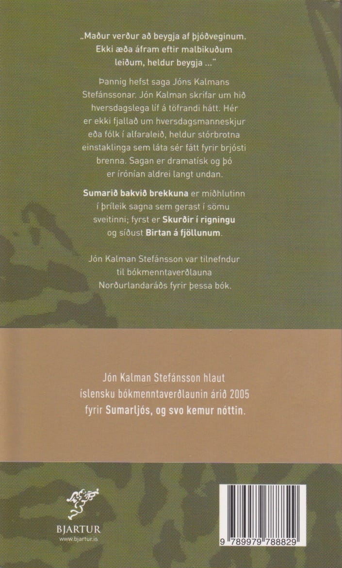 Sumarið bakvið brekkuna er miðhlutinn í þríleik sagna sem gerast í söu sveitinni; fyrst er Skurðir í rigningunni og síðust Birtan á fjöllunum.