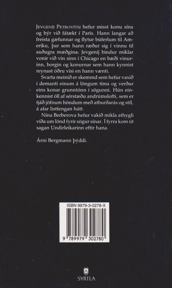Svarta meinið er skemmd sem hefur vaxið í demanti einum á löngum tíma og verður eins konar grunntónn í sögunni. Hún einkennist öll af sérstæðu andrúmslofti, sem er tjáð jöfnum höndum með atburðarás og stíl, á afar listfengan hátt.