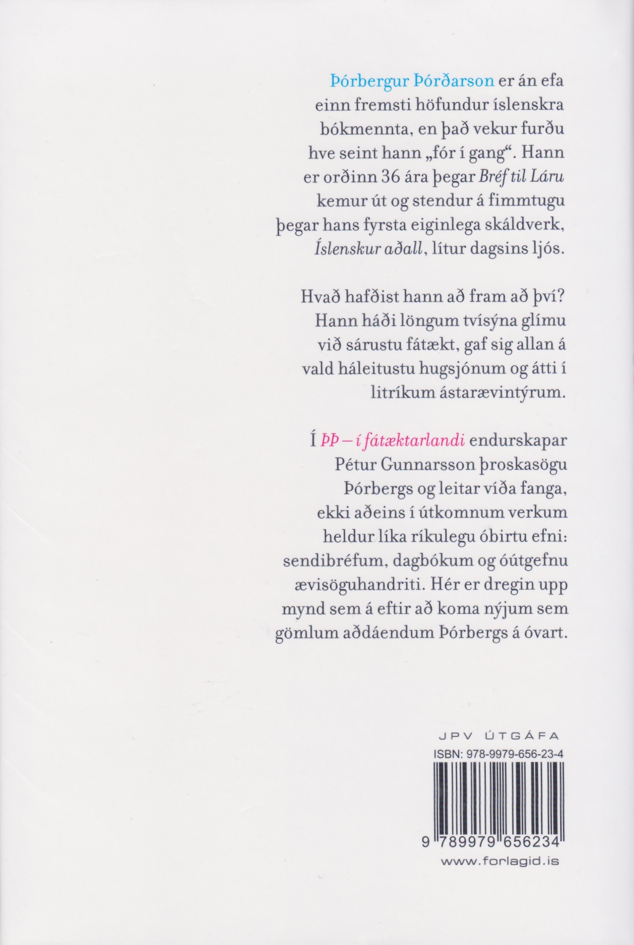 Í ÞÞ – í fátæktarlandi endurskapar Pétur Gunnarsson þroskasögu Þórbergs og leitar víða fanga, ekki aðeins í útkomnum verkum heldur líka ríkulegu óbirtu efni: sendibréfum, dagbókum og óútgefnu ævisöguhandriti. Hér er dregin upp mynd sem á eftir að koma nýjum sem gömlum aðdáendum Þórbergs á óvart.