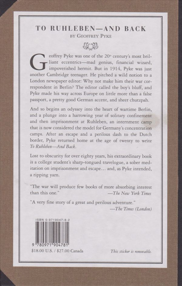 And so begins an odyssey into the heart of wartime Berlin, and a plunge into a harrowing year of solitary confinement and then imprisonment at Ruhleben, an internment camp that is now considered the model for Germany’s concentration camps. After an escape and a perilous dash to the Dutch border, Pyke returned home at the age of twenty to write To Rubleben – And Back.