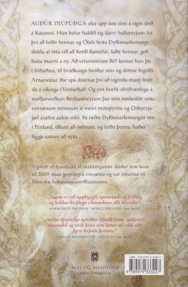 Að veturnóttum 865 kemur hún þó í föðurhús, til brúðkaups bróður síns og dóttur Ingólfs Arnarsonar. Þar spá dísirnar því að vígroða muni brátt slá á víkinga í Vesturhafi. Og víst horfir ófriðvænlega á norðanverðum Bretlandseyjum þar sem innfæddir veita norrænum mönnum æ meiri mótspyrnu og Orkneyjajarl ásælist aukin völd. Þá ræðst Dyflinnarkonungur inn í Péttland, öllum að óvörum, og leiðir þeirra Auðar liggja saman að nýju …