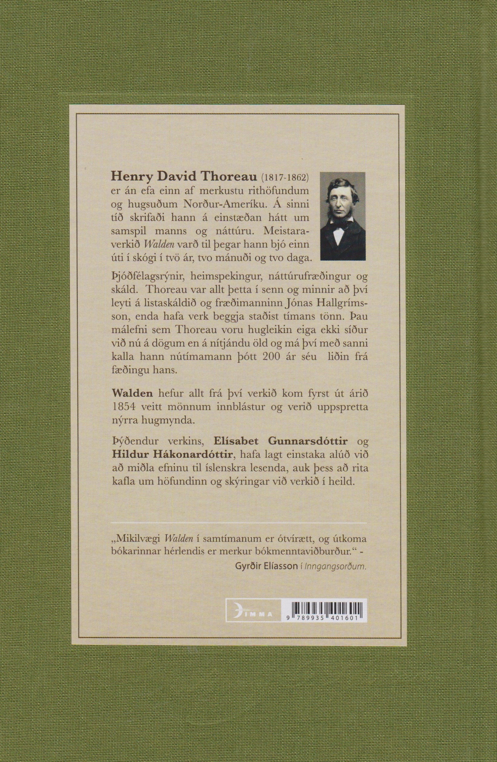 Meistaraverk eins merkasta höfundar og hugsuðar Norður-Ameríku. Þau málefni sem Thoreau voru hugleikin eiga ekki síður við nú á dögum, enda hefur Walden allt frá því verkið kom fyrst út árið 1854 veitt mönnum innblástur og verið uppspretta nýrra hugmynda. Nú í fyrsta sinn á íslensku, þegar 200 ár eru liðin frá fæðingu höfundarins.