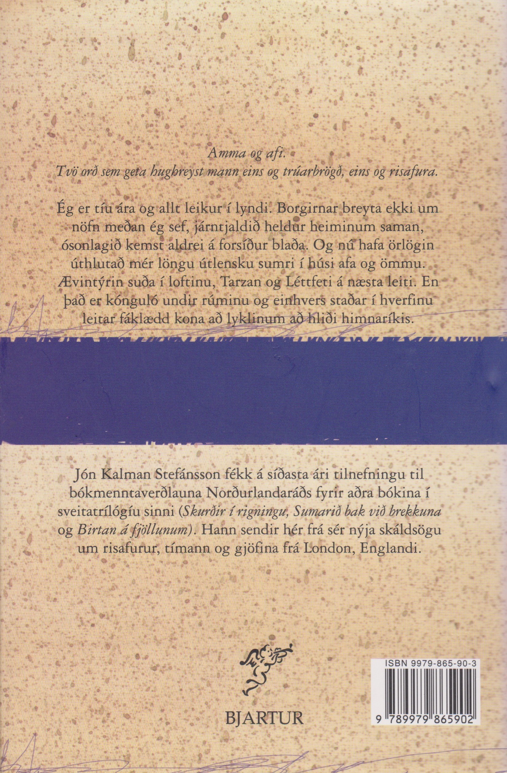Jón Kalman Stefánsson fékk á síðasta ári tilnefningu til bókmenntaverðlauna Norðurlandaráðs fyrir aðra bókina í sveitatrílógíu sinni (Skurðir í rigningu, Sumarið bak við brekkuna og Birtan á fjöllunum). Hann sendir hér frá sér nýja skáldsögu um risafurur, tímann og gjöfina frá London, Englandi.